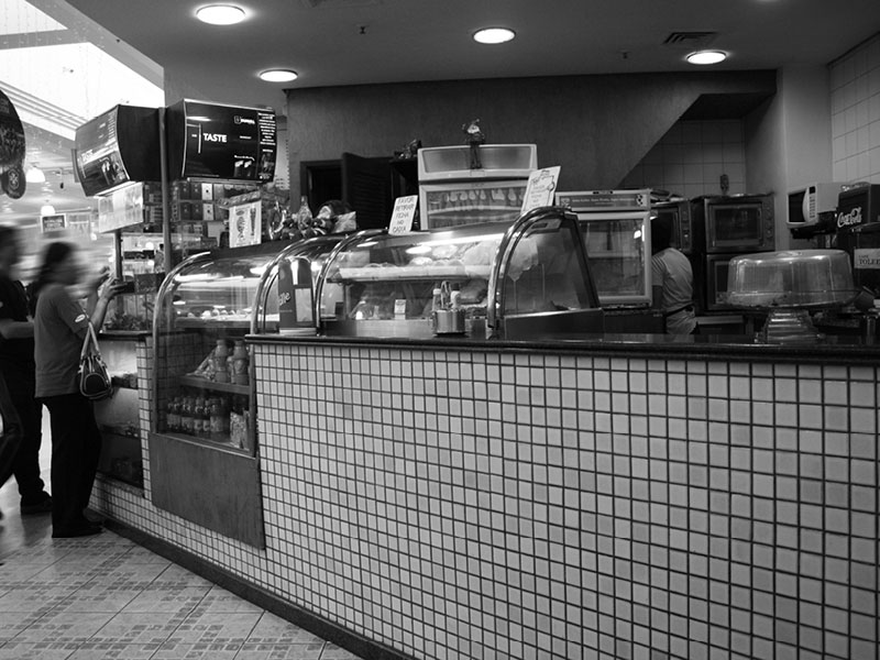 A apresentação desta cafeteria era bastante confusa. Possuía o luminoso em vinil com muitas cores e desenhos, vários tipos de revestimentos cerâmicos que não harmonizavam entre si, além de vitrines com tamanhos e formatos diferentes.
