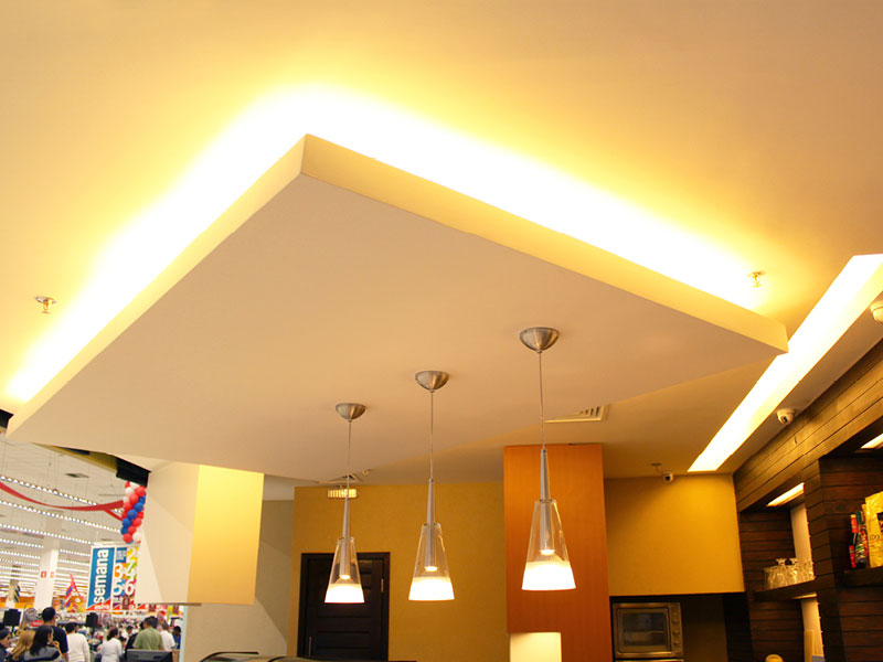 O projeto de reforma buscou uma linguagem mais clean, simplificando e organizando os volumes do caixa (elementos verticais), balcão e projeção da sanca de gesso (elementos horizontais).