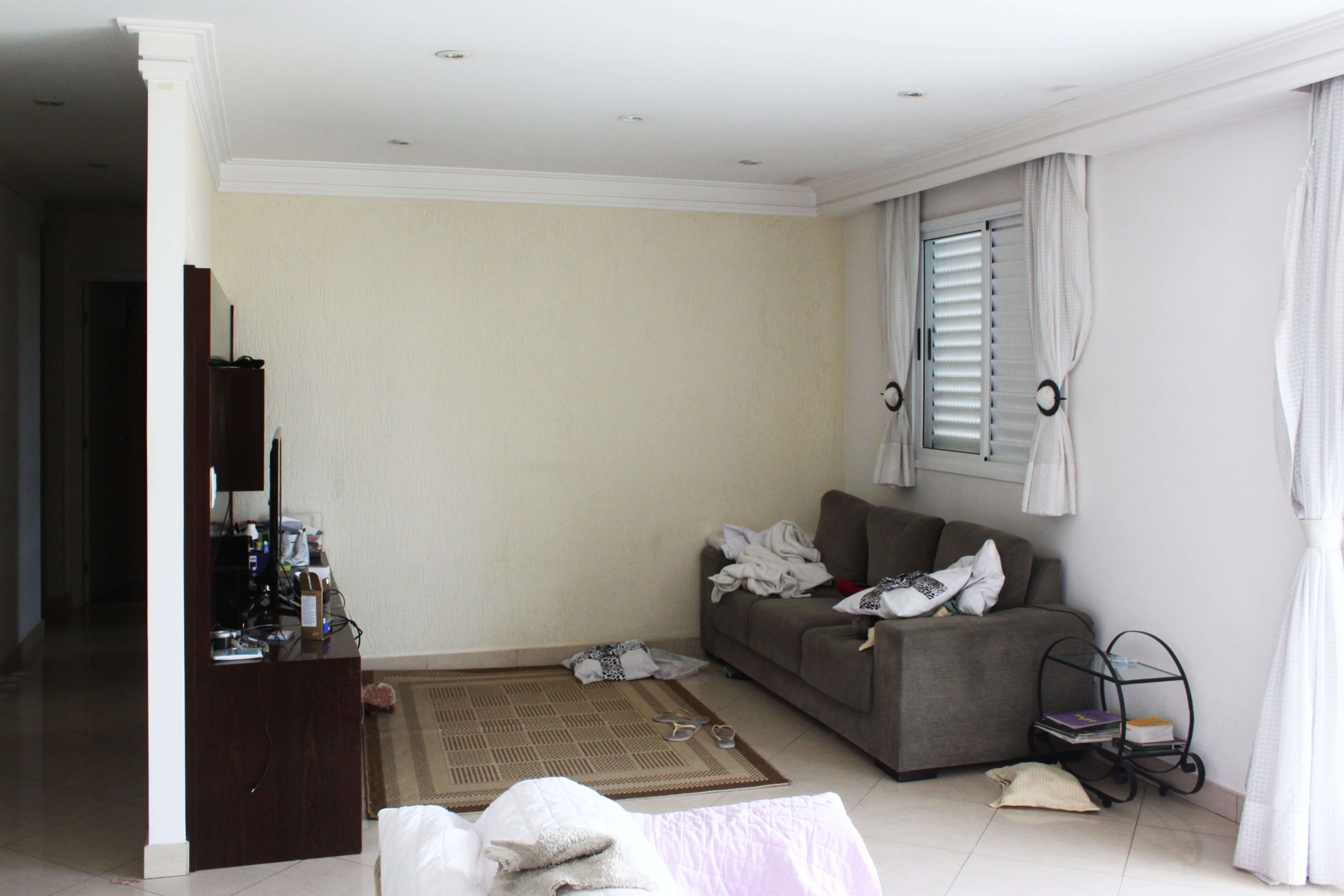 A parede da sala foi removida e os móveis novos foram projetados de modo a tornarem os ambientes mais amplos e práticos. O painel de TV recebeu lâmpadas de led para criarem um efeito mais aconchegante. O aparador e o armário alto ajudam a organizar o espaço, ao mesmo tempo, que servem de suporte para a sala de jantar.